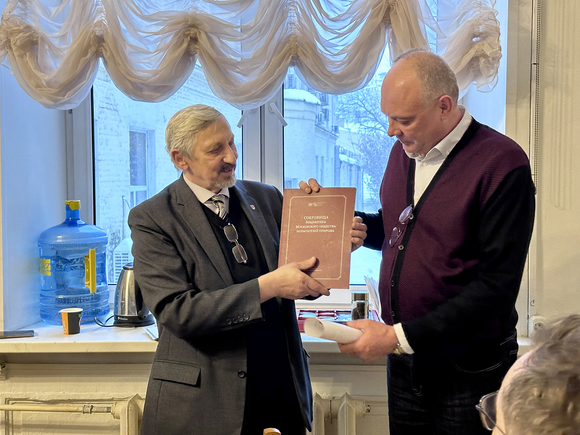 Завершилось заседание Круглым столом секции музеологии МОИП и Ученого совета БЕН РАН. На нём прозвучали доклады А.В. Смурова (д.б.н., проф., директор Музея землеведения МГУ имени М.В. Ломоносова, Председатель секции музеологии МОИП) «Московское общество испытателей природы – 220 лет служения России», А.В. Иванова (к.г.-м.н., вед. н.с. Музея землеведения МГУ имени М.В. Ломоносова, с.н.с. Института географии РАН, руководитель экспедиции «Флотилия плавучих университетов») «Этапы и события в истории геонаучной русскоязычной периодике 19-21 веков: к юбилеям изданий «Землеведение» и «Жизнь Земли», Е.Н. Бочаровой (с.н.с. БЕН РАН) «О формировании коллекции «Естественно-научные журналы Российской Империи в Едином фонде БЕН РАН»» и Ю.Б. Евдокименковой (в.н.с. БЕН РАН) «О деятельности Экспертного совета БЕН РАН по книжным памятникам». На заседание А.В. Смуров передал директору БЕН РАН О.О. Махно уникальное издание «Сокровища Библиотеки Московского Общества Испытателей природы».