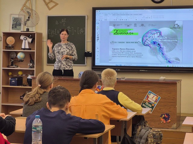 Всероссийская акция «Учёные – в школы» способствует популяризации науки среди школьников и позволяет им узнать новую, полезную и актуальную информацию. С 2022 года это мероприятие проходит под эгидой объявленного президентом В.В. Путиным Десятилетия науки и технологий в Российской Федерации. В рамках Фестиваля науки 0+ «Учёные – в школы» к.б.н., с.н.с. музея землеведения МГУ И.П. Таранец выступила 10 октября 2025 г. в школе №2114 с научно-популярной лекцией «Что такое экология?».