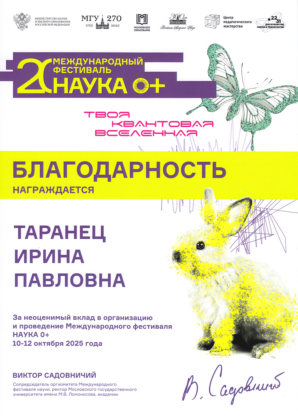 На одной из центральных площадок ХХ Международного фестиваля науки 0+ в Шуваловском корпусе Московского государственного университете имени М.В. Ломоносова 12 октября 2025 г. старший научный сотрудник Музея землеведения к.б.н. И.П. Таранец прочитала лекцию «Экологические аспекты благополучия города: взгляд эколога». Лекция была посвящена различным экологическим аспектам городской среды. На ней были подняты вопросы, которые касались «устойчивого города», здоровья человека, рассказывалось, каким образом загрязнение окружающей среды может способствовать увеличению заболеваемости населения.