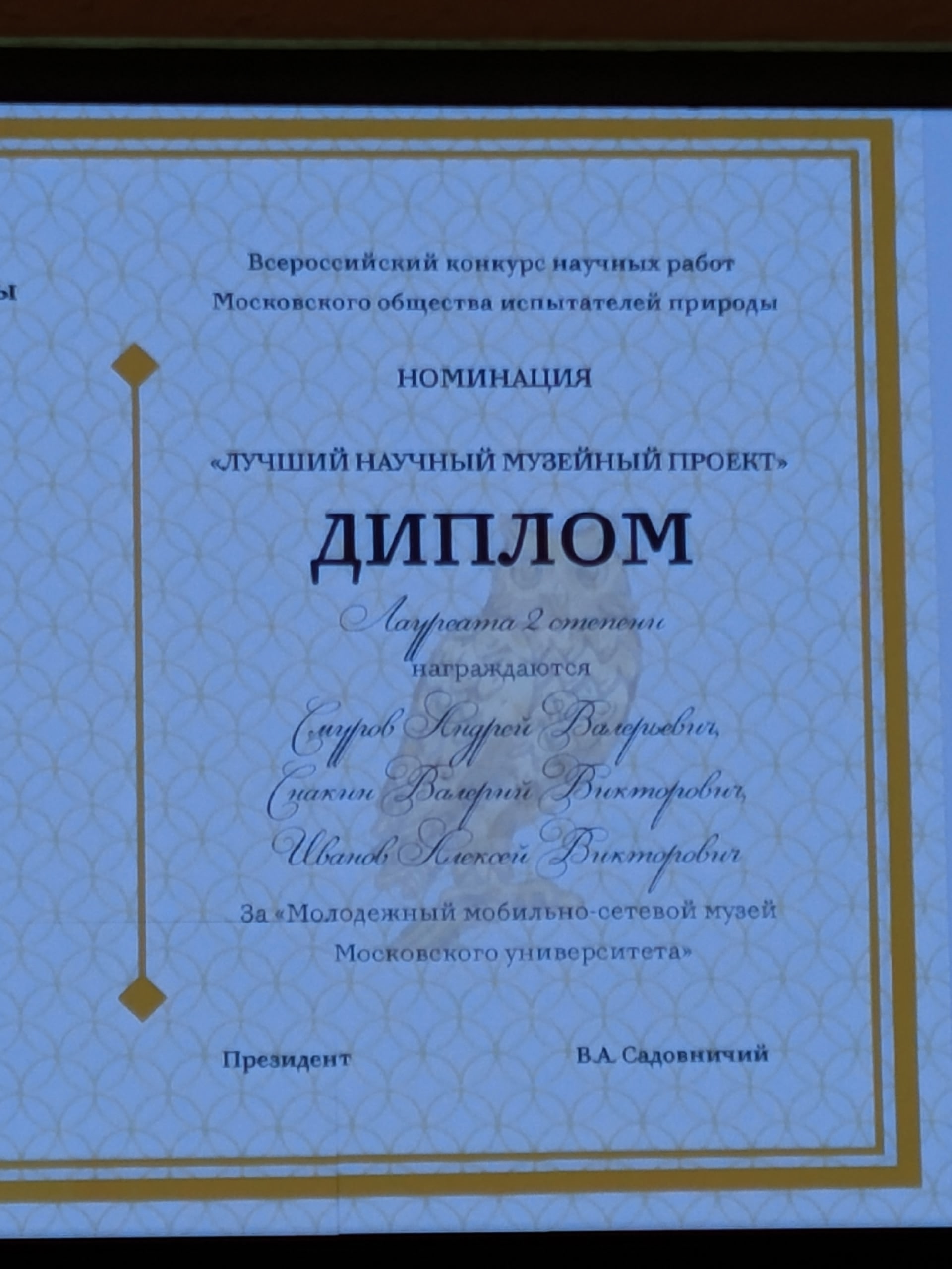 В номинации "Лучший научный музейный проект" диплом лауреата второй степени получил проект Музея землеведения "Молодёжный музей", осуществляющийся под руководством директора музея, профессора А.В. Смурова, завсектора музея профессора В.В. Снакина и ведущего научного сотрудника А.В. Иванова. Проект «Молодежный музей» создан для вовлечения студенческой молодежи и школьников в деятельность по изучению и сохранению природного и культурного наследия. Он предполагает развитие экспериментальных музейных площадок как в самом Московском университете (на базе Музея землеведения, Ботанического сада, Университетской гимназии, исторического факультета и др.).