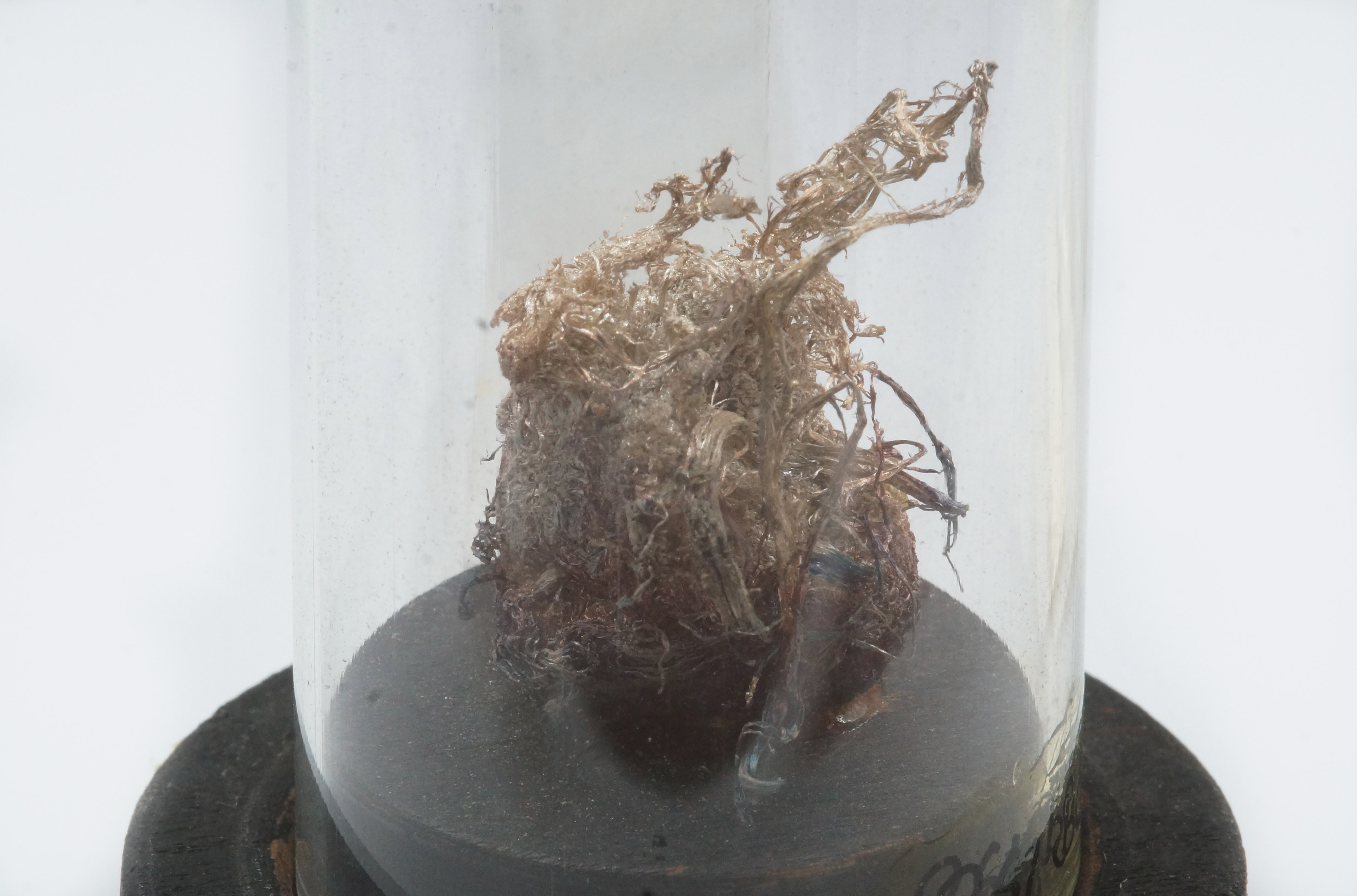 - На слюдистом сланце ОФ 155 (323г; 96,3х63,3х39мм), Богемия, ЧССР, от Новочеркасского политехнического института, 1955г. 8. Медь и серебро самородные, сростки. ОФ 760, (30,1г; от 11,6х10,4мм до 18,2х13,3мм), Мичиган, США