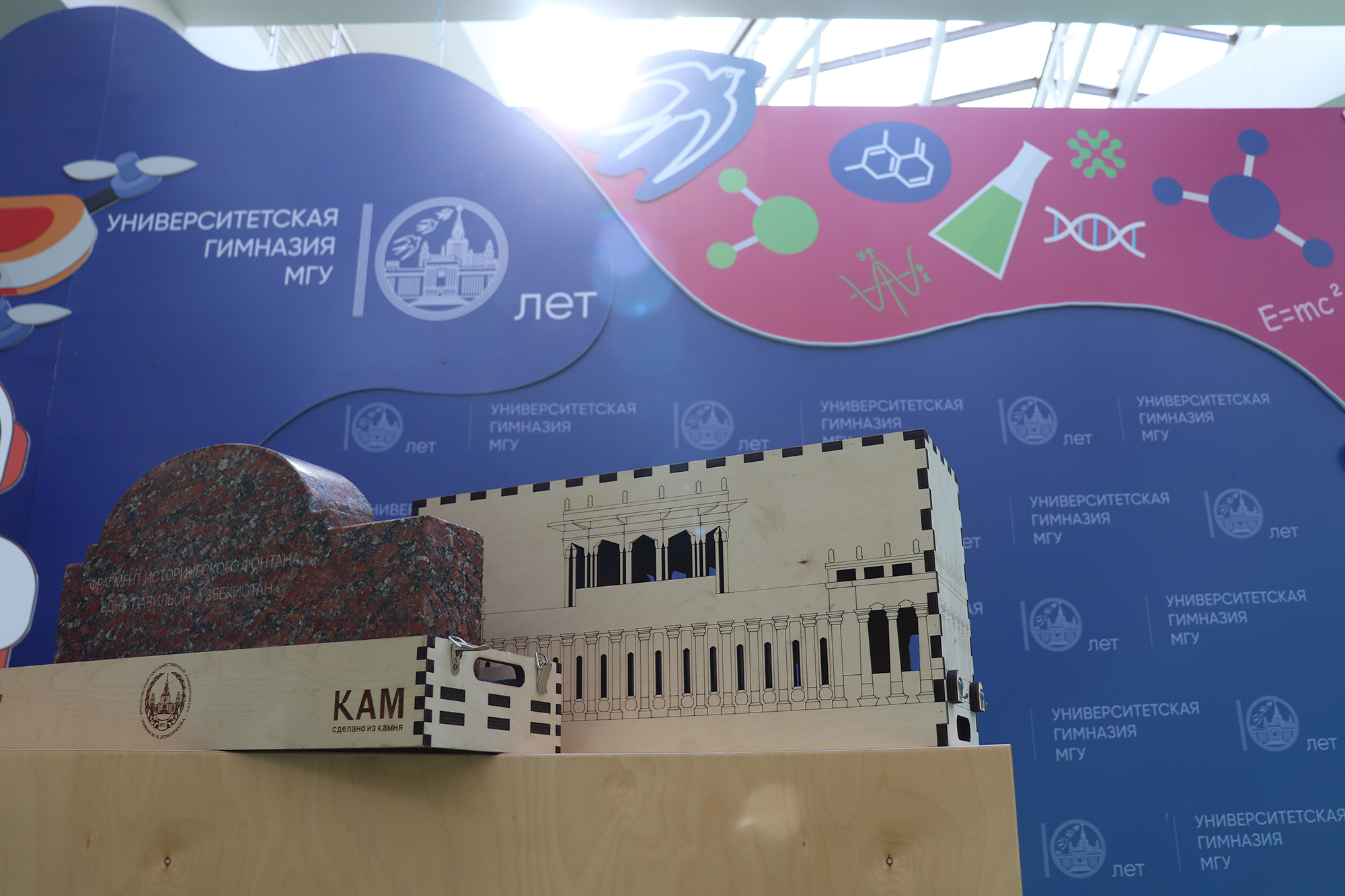 Музей землеведения МГУ поздравил Университетскую гимназию с 10-летием. 7 апреля 2026 года в холле Гимназии в пространстве у Молодежного музея (кластер «Университетское Лукоморье») директор Музея землеведения МГУ, председатель секции музеологии МОИП, профессор Андрей Валерьевич Смуров торжественно вручил новый экспонат для коллекции музея Гимназии – фрагмент исторического фонтана павильона ВДНХ «Узбекистан», выполненного из карельского гранита. Андрей Валерьевич поздравил от лица Музея Землеведения коллектив Гимназии и ее директора, профессора Александра Кирилловича Гладилина с 10-летием и передал поздравительный адрес. Затем участники перешли в помещение библиотеки, где состоялся круглый стол по взаимосвязи экспедиционной и музейной деятельности.