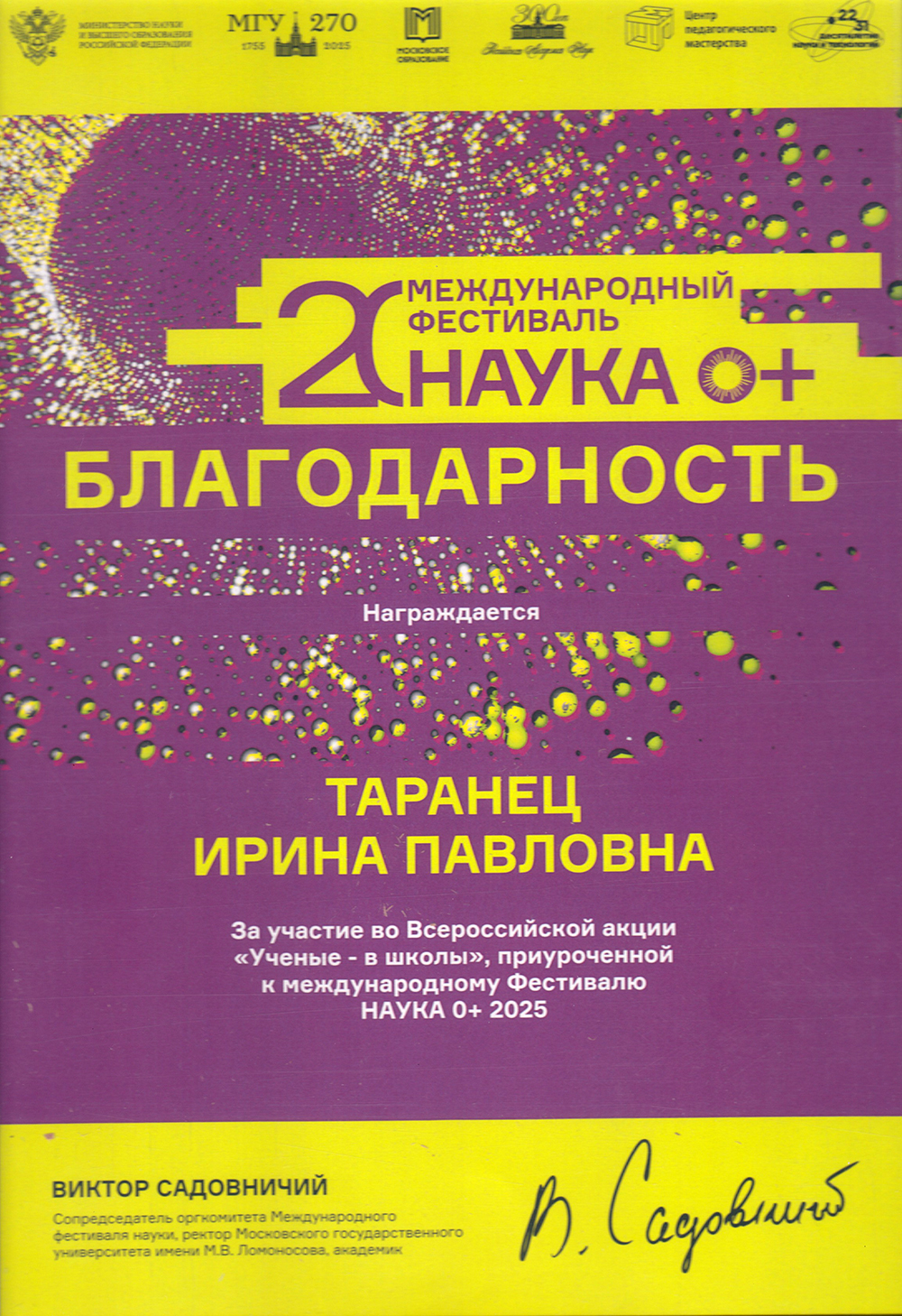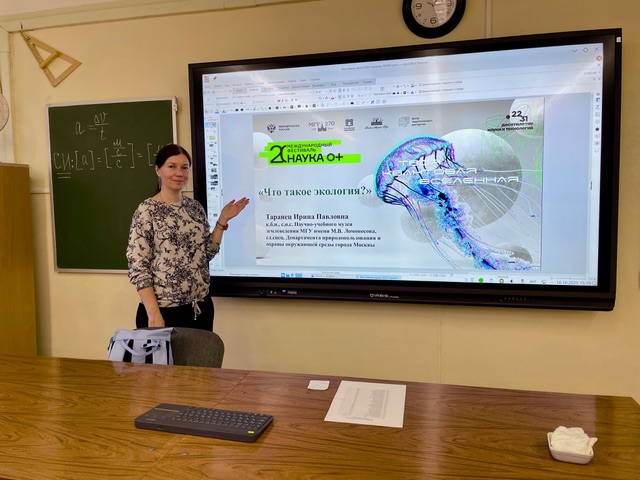 Всероссийская акция «Учёные – в школы» способствует популяризации науки среди школьников и позволяет им узнать новую, полезную и актуальную информацию. С 2022 года это мероприятие проходит под эгидой объявленного президентом В.В. Путиным Десятилетия науки и технологий в Российской Федерации. В рамках Фестиваля науки 0+ «Учёные – в школы» к.б.н., с.н.с. музея землеведения МГУ И.П. Таранец выступила 10 октября 2025 г. в школе №2114 с научно-популярной лекцией «Что такое экология?».